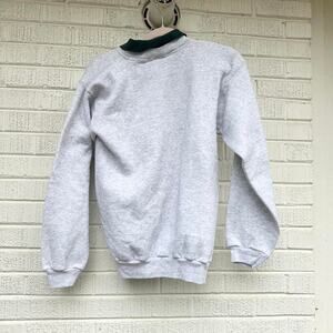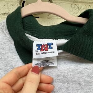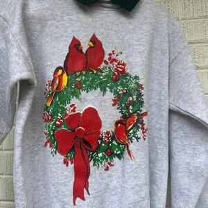 Vintage 90s TNT by Trau & Loevner Christmas sweatshirt. Heather gray fleece pullover with a dark green collar insert and festive wreath graphic featuring bright red cardinals, holly, and a large red bow. Soft cotton-poly blend with a cozy inside — the perfect kitschy holiday piece for layering or lounging.