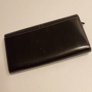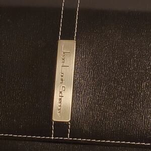 Travel Bifold Wallet For Women by Jean-Louis Scherrer Paris. Black leather. Perfect shape - see photos for details. Very hand, credit card slots, ID window, several internal compartments, external open pocket, zipped change/bill pocket. Silver tone hardware. Size 7.5"x4".