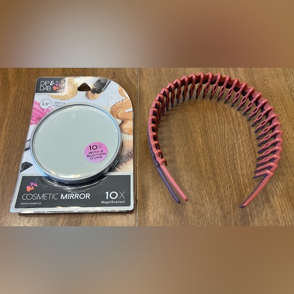 This mirror is perfect for on the go at only 3.5 inches! Sleek enough for your purse, make up bag or travel case. With 10x magnification, you won’t be able to miss anything. Included are two NEW headbands to help hold your hair back during use.