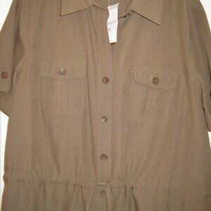 Travel Dress - Mocha - Light Brown. Size 16W. This dress is new and never worn. It is from Appleseed's. Crinkle texture for wrinkle resistance. It is 54% Polyester - 46% Rayon. Machine Washable on Gentle Cold. Line Dry. It is a beautiful light brown that I would call mocha. It measures 22" from armpit to armpit and is 45" long from the collar. The waist is adjustable.