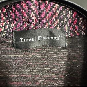 Travel Elements lightweight open front sweater in size large. Black/pink/purple marled, handkerchief hem, 96% polyester/4% spandex. 3/4 sleeve.