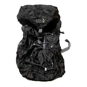 Polyester packable backpack featuring a printed Alaska Summit logo. Bag features a main pocket with inside divider panel and cinch top with plastic pinch toggle, a smaller zippered top pocket, inside zippered top pocket, two stretchy side pockets, an elastic zig-zag cinch strap, a woven handle, foam padded back, and adjustable foam padded shoulder straps. Bag stuffs easily into top zip pocket for storage.