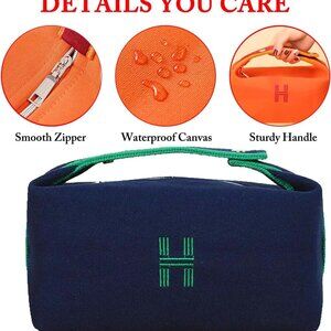 & The makeup bag boasts a stylish, colorful webbing handle with snap button and classic canvas design, adding a touch of elegance to your accessory collection. It stands out with its chic and fashionable look.