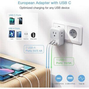 European Travel Adapter USB C: Dual USB A ports can charge up to 2.4A, and the USB C port can charge up to 3A; Ideal for charging cell phone, tablet, laptop, earphone in dorm, bedroom and bathroom; Note: The USB-C port is not Quick Charger 3.0, doesn't support any other devices which need 9 to 22V charging voltage