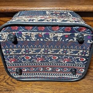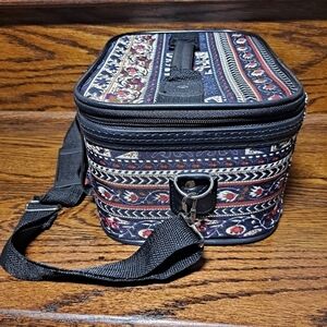 Beautiful hardside travel makeup case with a colorful elephant print. The case has 5 spaces for brush storage and one exterior zippered pocket. The case is unused and has the protective film on the mirror inside. Long adjustable strap is detachable and it also has a top handle for easy carrying.