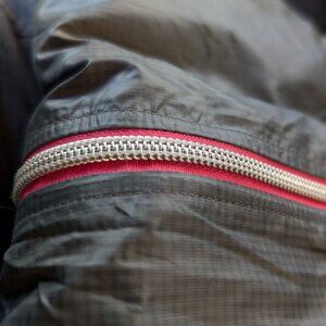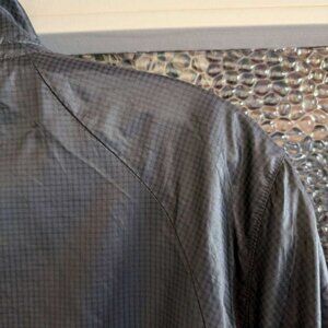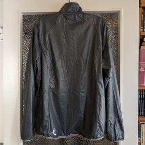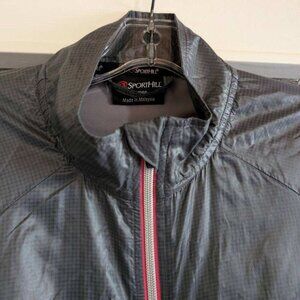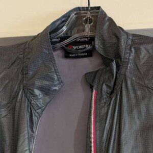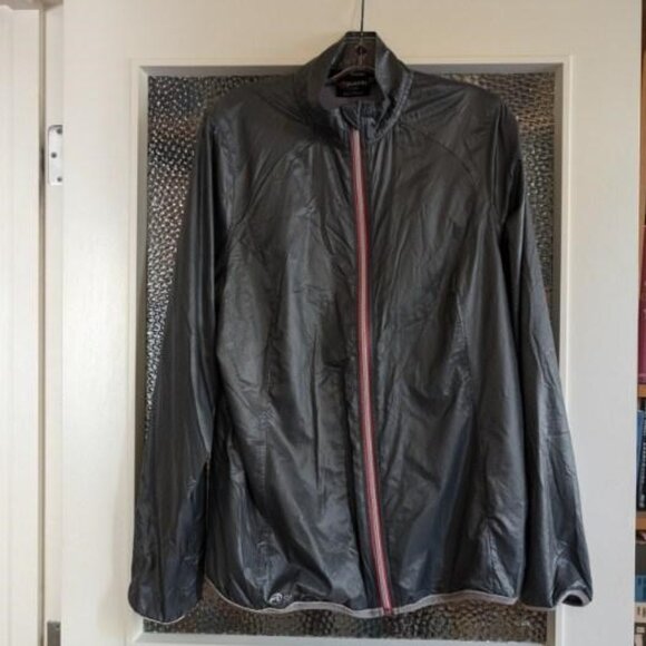 As-new lightweight ripstop nylon windbreaker, soft silky gray material. Bandon jacket by SportHill, from REI. Light, lined, bold pink and steel zipper with smooth action, plus inside pink zippered pocket. Gray trim at hem and on lightly elasticized cuffs. Unlined double-sided collar with small fold over top of zipper to keep out drafts. Comfortable fit, not fitted, not loose. Great travel jacket because it wads up to a small fist-sized bundle. Perfect "extra" layer in a sudden breeze. Stash in your car for walks by the water with your dog. Size L. Excellent condition, like new. Purchased at REI.