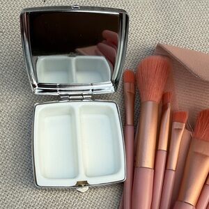 Cute floral pill case with mirror inside. 8 make up brushes in carrying case. Very convenient.