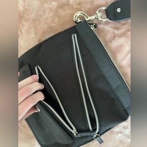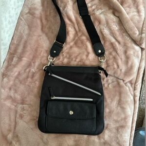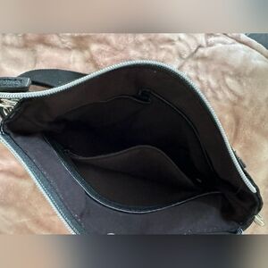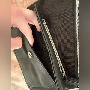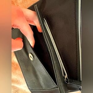 great flat, compact travel bag is made of leather, canvas mesh, and solid chrome handle hooks, like new, adjustable strap. roughly 10x10"