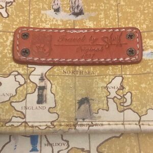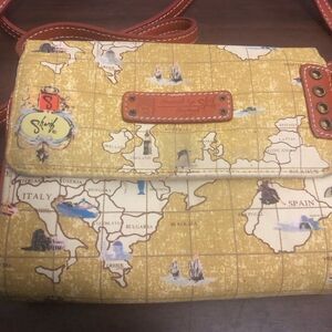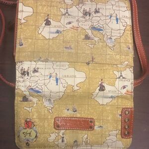 Travel by Sharif Maps of The World yellow crossbody bag with leather trim and strap. Snap closure. Middle zip closure. Three compartments. Inside pockets. Pockets for credit cards. Strap 24” drop. Preowned