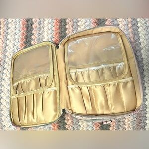 Multi colored, travel makeup bag. Two compartments. Too compartment for brushes, bottom compartment for all other makeup and skincare products. Missing bag divider.
