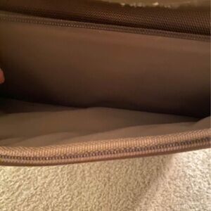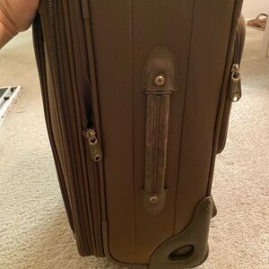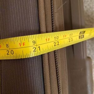 TravelPro Crew7 Light Brown 15 1/2W by 22L CARRY-ON MEDIUM LUGGAGE. The outside material of this Luggage is not the hard type where you can wipe but both the outside and inside can be wiped easily in this. This is brand new has only been used twice it has Two Wheels as you can see in the pictures in which it does stand straight without falling as well as the top handle does go up when you need to take it around and down it can also be midway as well if you don’t want all the way up along with it has one handle on the top and side to carry it. Also, it is great quality brand and Luggage that is lightweight and convenient to take around in which this is a Carry ON and Medium Luggage that will work with the Travel Restrictions. I have taken pictures of the measurements that you can see to get an idea of the measurements and put that in this listing here are the measurements The Width how Wide it is approximately 15 1/2 inches. The Length how tall it is approximately 22 Inches.