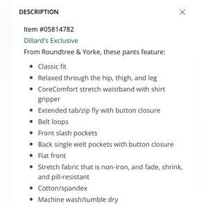 Stretch fabric w/ stretch “CoreComfort”waistband, shirt gripper, tab/zip fly with button closure, Belt loops, front slash pockets, Back single welt pockets with button closure, Flat front.