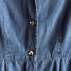 Stylish denim midi dress with button-up front. Short sleeves and classic collar. Ideal for casual wear.