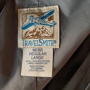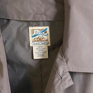 TravelSmith Long Gray Raincoat with 5 Buttons, Multiple Pockets.100% Polyester with 100% Nylon Lining. Men's Size Regular Large with approximate measurements laying flat: pit to pit 27", Sleeve length 26", Length 49".