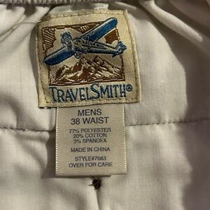 Keywords: Travel Smith, men's pants, casual pants, size 38, beige pants, elastic waistband, flat-front, straight leg, button closure, solid pattern, pre-owned, good condition.