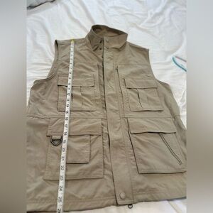 TravelSmith Mens Sz:M Tan khaki Vest Hunting Fishing Tactile Zip Pockets Buckle Vented Lined. Full zip and snap closure. Multiple pocket. Rear fill zip pouch. Inner zip pocket and slash pocket. Great used condition. A few very small areas of discoloration. Noted in the photos - could launder out. No rips or defects. Please see pictures for measurements.