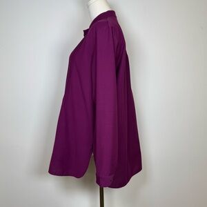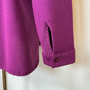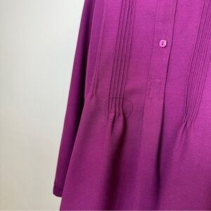 TravelSmith Purple Tunic Blouse Women’s Size Medium. Pullover, button front, pin tuck detail, button cuffs, round stand-up collar, wrinkle resistant, side split rounded hem. Tiny spot at base of pin tuck barely noticeable, see last picture for reference. Very good preowned condition. Approximate measurements 28.5” top of shoulder to hemline, 22” across chest, 24” sleeves.