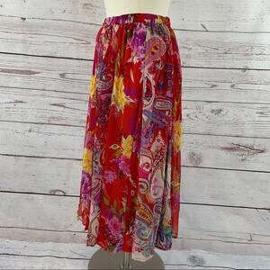 TravelSmith crinkle skirt. Red patterned tiered, boho style, maxi skirt. Lightweight, lined with red, has a sheer overlay. Small pocket at inside waistband front. Elastic waistband.