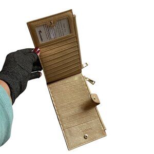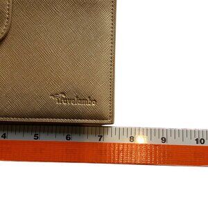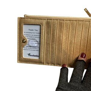 Designed with precision and attention to detail, this Travelambo wallet offers RFID blocking to protect your cards. The clutch style, combined with a zippered pocket and ID window, ensures both security and convenience. Its elegant gold exterior adds a sophisticated touch to any ensemble.