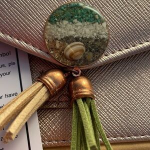 A very unique wristlet with beautiful tassels and handmade emblem with small seashell ๐ and sand