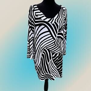 Travelers by Chicos 2. (12-14) M black and white with long sleeves and V-neck. Sides have a little slits at the hips, made of 95% acetate and 5% spandex, stretchy. Multi Directions stripes.