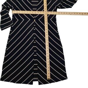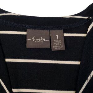 Description: Travelers by Chicos Long Cardigan Duster Geo Stripe Slinky Navy Blue Size 1 M/8