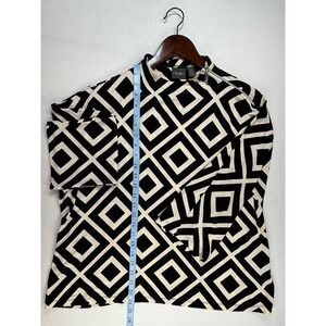 Keywords: Travelers by Chico's, geometric top, mock neck, black beige, long sleeve, size 3, women's top, blouse, diamond pattern, contemporary fashion, travel clothing, ladies top