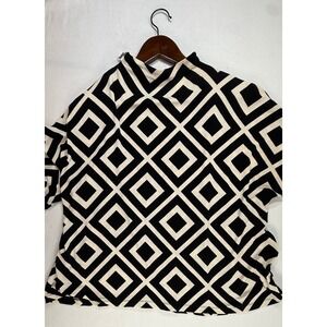 Chic geometric long sleeve top featuring a diamond pattern in black and beige. This striking top boasts a mock neckline, providing a touch of sophistication, and is designed for a comfortable fit. Crafted by Travelers by Chico's, it offers both style and ease. The unique geometric pattern adds a modern edge, making it a standout piece in any wardrobe. Perfect for business casual settings, travel, or a stylish lunch date.