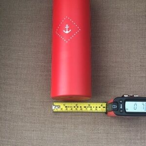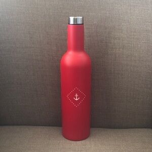 Great traveling red bottle with white anchor design that can be used for water or wine to keep fluids cold. Only used a few times as can be seen by pic of inside bottle. Has very minor dents on bottom.