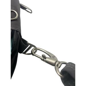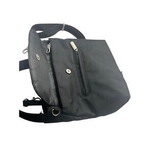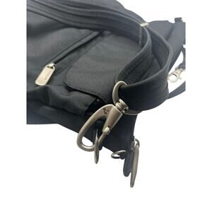 Interior organizer with RFID blocking passport and card slots. Front zippered pocket locks under magnetic snap flap. Front and rear zippered pockets for quick grab items. Adjustable shoulder strap.