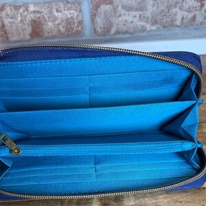 The interior is lined with a vibrant blue fabric, making it easy to see and access your belongings. Inside, you'll find plenty of space with multiple card slots, slip pockets for cash or receipts, and a zippered coin pocket. It's even spacious enough to hold most smartphone models in one of the main compartments.