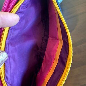 Adorable Safe ID Daisy wallet from Travelon. This lightweight wallet is perfect for travel with small size and light weight. It's in really good condition, the only defect is some loose stitching on the credit card slots (see last two photos). It measures 8" x 4", has two zip pockets with credit card slots, an ID slot in between the two zip pockets, and an exterior zip coin pocket. Many credit/debit cards have RFID chips with personal data. Effectively blocks RFID readers from capturing information. Please let me know if you have any questions.