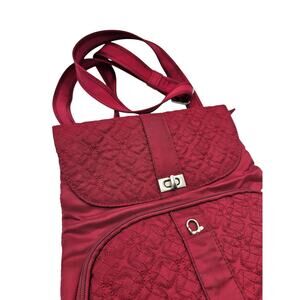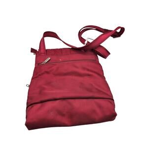 This Travelon crossbody purse is perfect for travel or everyday use. It is made of quilted material and has RIFD security to protect your cards. The purse is a beautiful dark red color and is in excellent condition.