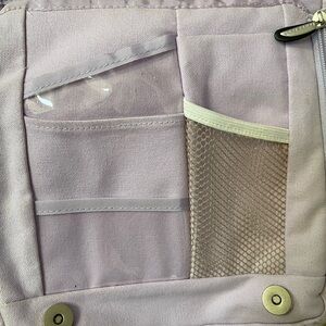 Practical + cute everyday crossbody by Travelon in a soft lilac (reads light lavender/very pale purple in some lighting) with a chocolate-brown webbing strap and warm tan lining. Designed with tons of organization: