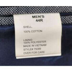 The Travelsmith 44R Gray 2 Button Sport Coat Blazer Jacket Shell is a stylish and versatile addition to any man's wardrobe. Made from a blend of 100% cotton and polyester, this jacket features a solid gray color and a classic two-button front closure. The regular fit and double-vented back provide both comfort and sophistication, making it perfect for all seasons. With its notch lapel style and inner pockets, this blazer by TravelSmith is a timeless piece that can be dressed up or down for any occasion.