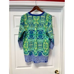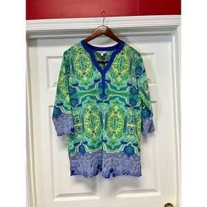 Travelsmith Blue & Green Print Tunic Top sz L EUC BOHO