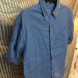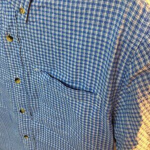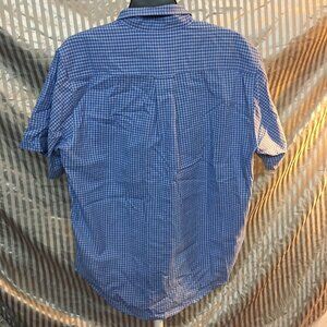 Selling a used Travelsmith Men's Short Sleeve Button Down Plaid Shirt in great condition no rips or stains all buttons are there. Shirt is made of 60% cotton and 40% polyester and is machine washable, Shirt features 1 left side chest pocket and is size Medium and color is Blue and White comes from a smoke free home.