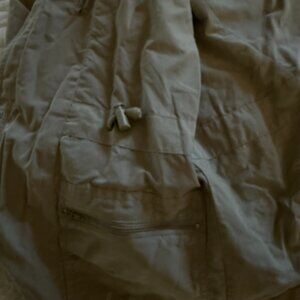 Awesome travel jacket. Drawstring waist, tons of pockets including RFID pocket, lightweight material.