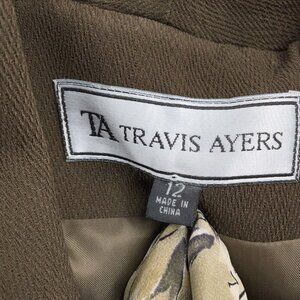 The Travis Ayers Skirt Suit in size 12 features a woven poly blend in a classic brown color, complemented by a floral scarf. Perfect for professional settings.