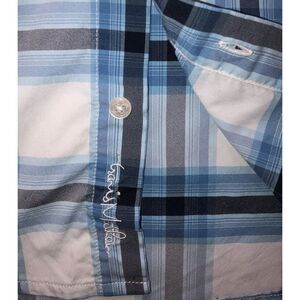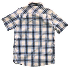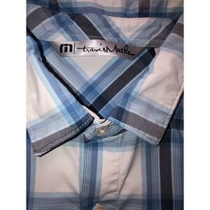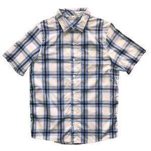 Travis Mathew Button Up Shirt Short Sleeve Stretch Blue Plaid Gray Check M