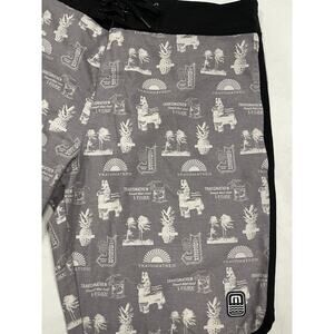 Get ready to hit the waves in these stylish Travis Mathew El Fiestro Board Shorts. Featuring a trendy 5 O'clock Beer Print, these gray board shorts are perfect for any surfing or recreational activity. The quick-dry material and drawstring waist ensure a comfortable fit, while the above-the-knee design and back pocket provide added convenience. They have a back pocket that zips closed.