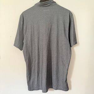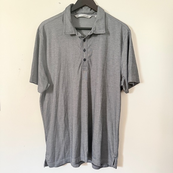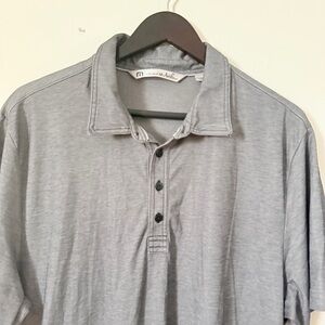 Soft and breathable TravisMathew short sleeve polo in heather gray. Features a three-button placket and contrast stitching for a laid-back, athletic look. Great for golf, work, or casual wear. Size XL.