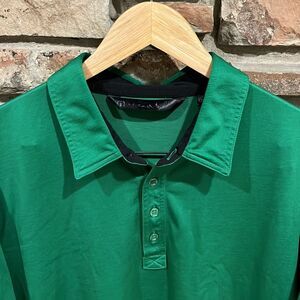 Travis Mathew kelly green golf polo. Pima cotton polyester blend fabric. Four button collar. Wear on collar fold as shown. Very small flaw on the front in closeup of fabric photo. Good preowned condition, see photos. Most items ship next business day.