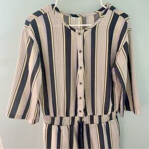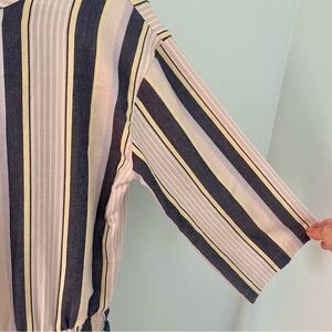 super-soft woven fabrics, the multicolored stripe delivers a delicious, subtle twill texture. As if you need more reasons to love this one, the wide sleeves and exaggerated button neckline adds the kind of details that will leave others asking, "Where'd you get it?!"