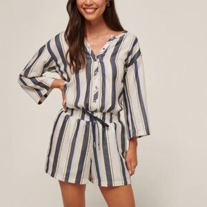 3/4 sleeve one piece romper in a navy, butter yellow, ivory stripe.