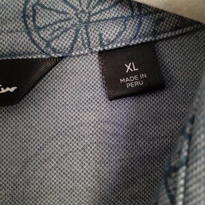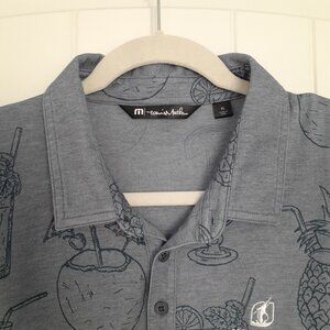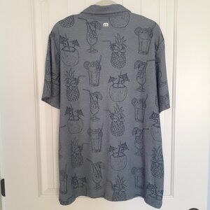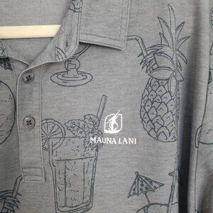 Very good pre-owned condition. Travis Mathew "Mauna Lani" Tropical Drink Pima Cotton Polo. Size: XL. Color: blue. 100% pima cotton. Machine wash. Short sleeve polo with three button placket, a tropical drink pattern, side slits at hem, and white embordered "Mauna Lani" resort logo.