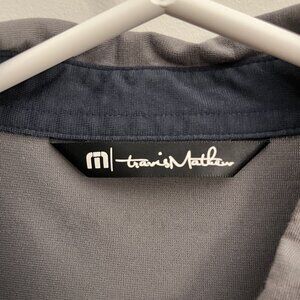 Travis Mathew Men’s Blue and Grey Short Sleeve Golf Shirt. Collar Shirt with three front buttons and Travis Mathew Logo on left breast and back of shirt. 53% Pima Cotton and 47% Polyester.