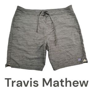 Travis Mathew Men's Striped High Rise Swim Trunk Board Shorts Gray White Size 40
