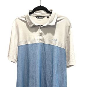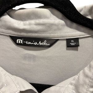 Keywords: Travis Mathew, gray polo, men's XL, golf shirt, casual wear, classic fit, color block, embroidered logo, button-up collar, high-quality fabric, short sleeve, men's fashion, versatile polo, pre-owned.