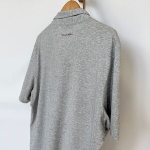 Keywords: Travis Mathew, gray polo, men's activewear, striped polo, collared shirt, chest pocket, signature logo, casual wear, golf shirt, machine washable, pre-owned, XL size, regular fit, cotton blend, polyester.